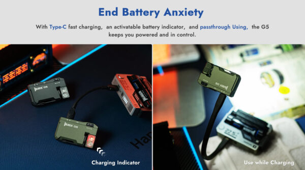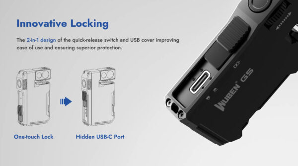 Зарядният фенер WUBEN G5 edc light е малко фенерче за ключодържател. Алуминиевият корпус е супер плосък и фенерче не е много голямо. Може би е дебело колкото запалка Зипо. Изглежда, че Wuben е взел опцията за странично осветление и нейните електронни/батерийни части от серията X2 Pro и е направил от тях свое ново фенерче. От тънката страна на корпуса, срещу светодиода и джобната щипка, има плъзгащ се превключвател, който можете да придвижите напред. Сега вече сте извън блокировката и можете да включите G5, като натиснете превключвателя за захранване точно над тази плъзгаща се част на фенера. Плъзнете напълно напред, за да получите достъп до USB порта за удобно зареждане чрез USB-C. Няма опваряне за което да говорим, тъй като получаваме вътрешна батерия, която не е нито достъпна, нито сменяема. При това положение Wuben G5 е с клас на защита IP68 за работа на 2 м под вода в продължение на 1 ч.