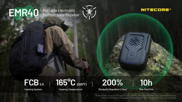Преносимото устройство против комари Nitecore EMR40 е отличен избор за любители на дейности на открито и градинари, които търсят лек, преносим репелент против комари. Той създава комфортна зона без насекоми в площ до 5 метра на открито и 3 метра на закрито. Благодарение на подобрената си ефективна система за отопление, EMR40 ускорява освобождаването на подложките против комари, което го прави 200% по-ефективен. EMR40 работи със сини подложки на базата на пиретроиди, елиминирайки необходимостта от цапащо пълнене с течност и опасност от пожар. С тегло само приблизително 225 г, EMR40 се предлага с щипка, която може да се прикрепи към чанти и MOLLE каишки за защита със свободни ръце. Зареждане на EMR40 има удължена продължителност на употреба от 10 часа и може да се зарежда чрез вграден USB-C порт. Можете дори да го зареждате, докато го използвате, за да поддържате непрекъсната употреба. Светлинните индикатори ще ви информират кой режим използвате в момента и кога е време за зареждане. Уредът дори има функция за памет, така че при повторно активиране EMR40 автоматично да извика последния използван режим. EMR40 е също така безопасен и надежден, с водоустойчивост IPX5 и здрава конструкция устойчива на удар до 1 метър. Независимо дали сте на трекинг, къмпинг, риболов, готвене или градинарство, EMR40 е чудесен инструмент за отблъскване на комари и други насекоми, както на закрито, така и на открито. EMR40 се предлага с 3 сини панелчета против комари. Плъзгате едната в слота в черния капак на EMR30. Тези сини подложки против комари ще променят цвета си от син на бял, когато е време да ги смените.