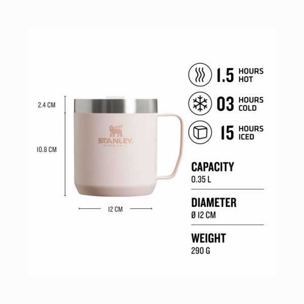 Къмпинг чашата Stanley The Legendary е проектирана да бъде съвместима с повечето кафе машини. Двустенната вакуумна изолация поддържа чая, кафето или друга напитка, горещо до 1.5 часа. Напитката ви може да остане, също така, студена до 3 часа и ледена до 15 часа. Перфектният партньор във вашите извънградски и градски приключения. Капакът на чашата, който и пасва перфектно е направен за лесно отпиване, за да се насладите на всяка капка. Къмпинг чашата от неръждаема стомана може да се мие, само на най-горния ред на съдомиялната машина.
