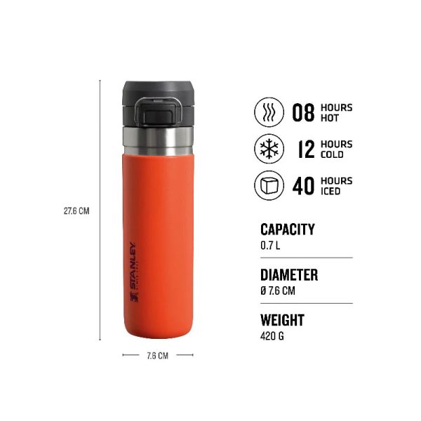 Термо бутилката Stanley Quick Flip Water Bottle 0.70 L е ваш постоянен спътник през деня без да се притеснявате, че ще трябва да спирате да презаредите студена напитка. Вакуумната изолация с двойна стена запазва любимата ви напитка гореща до 8 часа, студена до 12 часа и заледена до 40 часа. Quick Flip бутилката за вода с пуш бутон се събира в повечето поставки за чаши в автомобил. Тя е точният спътник за вашите градски и извънградски авантюри. Можете да изберете от широка гама цветове и размери според вкусовете си. Термо бутилката има двустепенен водонепропусклив заключващ се капак, подходящ за лесно отпиване и добавяне на лед. Може да сложите бутилката в багажа си без да се притеснявате от разливане.