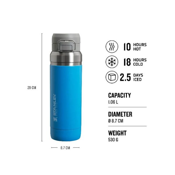 Термо бутилката Stanley Quick Flip Water Bottle 1.06 L е ваш постоянен спътник през деня без да се притеснявате, че ще трябва да спирате да презаредите студена напитка. Вакуумната изолация с двойна стена запазва любимата ви напитка гореща до 8 часа, студена до 12 часа и заледена до 40 часа. Quick Flip бутилката за вода с пуш бутон се събира в повечето поставки за чаши в автомобил. Тя е точният спътник за вашите градски и извънградски авантюри. Можете да изберете от широка гама цветове и размери според вкусовете си. Термо бутилката има двустепенен водонепропусклив заключващ се капак, подходящ за лесно отпиване и добавяне на лед. Може да сложите бутилката в багажа си без да се притеснявате от разливане.