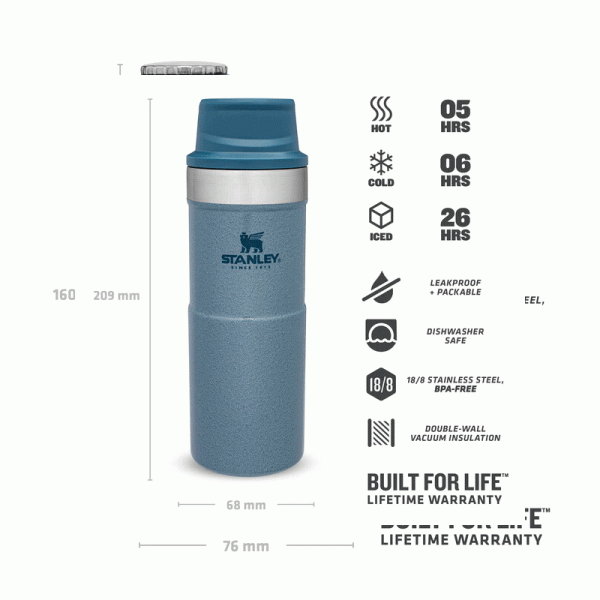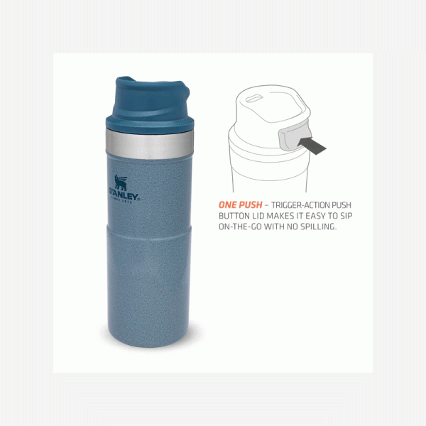 Термо чаша за път Stanley Trigger Action 0,35 л/12 унции водонепропусклива чаша за кафе, чай и вода, без съдържание на бисфенол А (BPA). Дизайнът на чашата Stanley Trigger Action ѝ позволява да се използва с повечето видове поставки за чаши, за да е с вас, докато пътувате. Вакуумната изолация с двойна стена запазва любимата ви напитка гореща до 5 часа, студена до 6 часа и заледена до 26 часа. Тя е точният спътник за вашите градски и извънградски авантюри. Можете да изберете от широка гама цветове и размери според вкусовете си. Чашата за пътуване със защита срещу протичане е лесен за използване с една ръка благодарение на капачката със заключващ механизъм. Капачето е с пуш бутон, който отключва приставката за пиене в горната част. Тази уникална функция прави чашата перфектна за отпиване в движение.