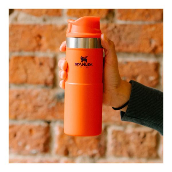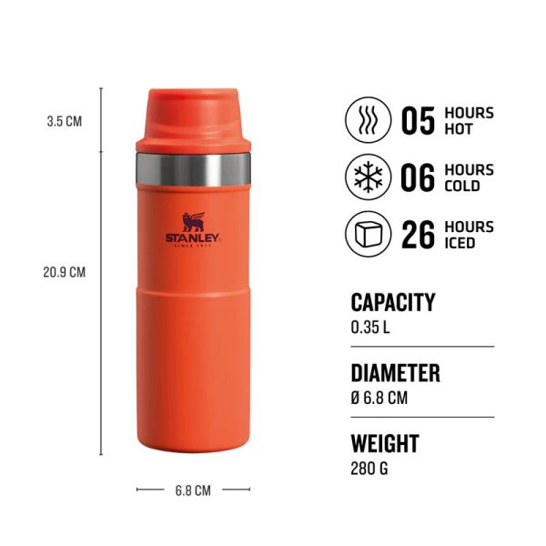 Термо чашата за път Stanley Trigger Action 0,35 л/12 унции е водонепропусклива чаша за кафе, чай и вода, без съдържание на бисфенол А (BPA). Дизайнът на чашата Stanley Trigger Action ѝпозволява да се използва с повечето видове поставки за чаши, за да е с вас, докато пътувате. Вакуумната изолация с двойна стена запазва любимата ви напитка гореща до 5 часа, студена до 6 часа и заледена до 26 часа. Тя е точният спътник за вашите градски и извънградски авантюри. Можете да изберете от широка гама цветове и размери според вкусовете си. Чашата за пътуване със защита срещу протичане е лесен за използване с една ръка благодарение на капачката със заключващ механизъм. Капачето е с пуш бутон, който отключва приставката за пиене в горната част. Тази уникална функция прави чашата перфектна за отпиване в движение.