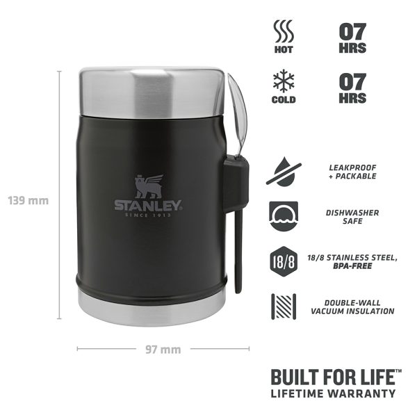 Термос за храна Stanley Classic Legendary Food Jar от неръждаема стомана без съдържание на бисфенол А (BPA). Термоса за храна от неръждаема стомана на Stanley е с първокласна изолация, която запазва вътрешната температура независима от външната до 20ч. за горещи или до 24ч. за студени храни. Той е точният спътник за вашите градски и извънградски авантюри. Термоса Stanley Classic Legendary Food Jar е създаден за дълготрайно използване с висококачествената си солидна конструкция от неръждаема 18/8 стомана за хранителни продукти. Капачката на термоса за храна на Stanley е водонепропусклива, така че можете да го сложите в раницата си, без да се тревожите от протичане. Широкото гърло на буркана улеснява наливането в капачката, която може да се използва и като купичка. Термоса за храна Stanley Classic Legendary Food Jar от неръждаема стомана е проектиран да се почиства лесно. Всяка част от него може да се мие само на най-горния ред на съдомиялната машина.