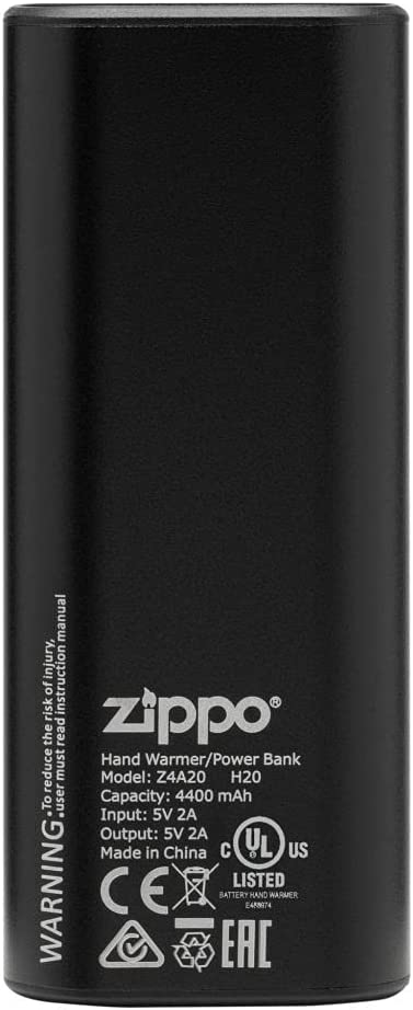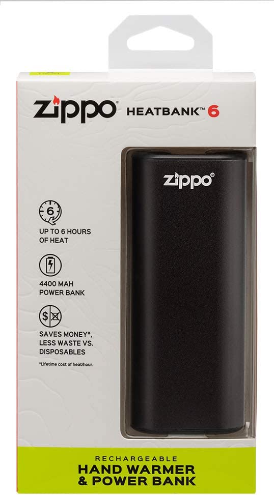 Джобен нагревател за ръце powerbank Zippo HeatBank 6s e съчетание от електрически нагревател за ръце с захранваща батерия. Той предлага удобна топлина за студени ръце и в същото време начин за зареждане на USB-съвместими устройства. Безжичният нагревател за ръце е идеалният спътник за хора, които обичат да са на открито или да работят навън и чиито ръце бързо изстиват по време на дейности. Топлина с натискането на един бутон загрява бързо и достига високи температури до 50 °C, с три различни нива на нагряване, 360° всеобхватна топлина, ръцете ви бързо ще се затоплят отново. HeatBank 6 излъчва топлина до 6 часа и по този начин остава топъл по-дълго от, например, конвенционалните нагреватели за ръце за еднократна употреба. Компактната форма с ергономичен дизайн приляга добре в ръката и се побира във всеки джоб. Захранва се от презареждаема литиево-йонна батерия от 4400 mAh.