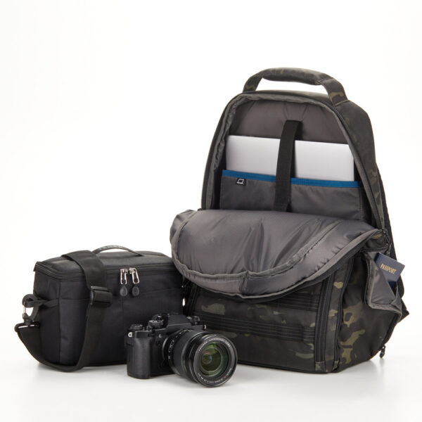 Раницата Tenba Axis V2 Road Warrior 16L Tactical е за компактна безогледална камера с 2 до 3 обектива. BYOB модулната вложка за камера може да бъде изцяло извадена, като така позволява раницата да бъде ползвана в ежедневието, освобождавайки място за други вещи. BYOB също така може да бъде ползвана и самостоятелно като чанта за камера, или да бъде поставена отново като вложка в друга раница или чанта. Освен фотографското оборудване, раницата може да побере таблет до 12 инча (33 cm) или лаптоп до 16 ина (40 см). Моделите от V2 сериите са изработени от здрави, устойчиви материи, така че да могат да се ползват в различни условия. Tenba официално се снабди с военен клас MultiCam Black™ плат, за да направи втори цвят за чантите на Axis. Екстериорът е от 600D MultiCam Black Poly. Интериор: Shadow ripstop найлон, 300g полирано трико. Серията тактически раници Axis V2 са обновени модели, вдъхновени от издържливите чанти за военните, които марката прави през своята повече от 40 годни история. Светлоотразителната лента MOLLE позволява големи възможности за прикрепяне на аксесоари Tenba Tools, калъфи за батерии или за карти памет и др. Коланът и автоматично регулиращите се ремъци Pivot-Fit позволяват раницата да пасне удобно на потребители с всякакъв размер. Axis V2 16L разполага с различни удобни джобове за паспорт, бутилка за вода, и има скрит джоб, съвместим с Apple AirTag или Tile Bluetooth Tracker.