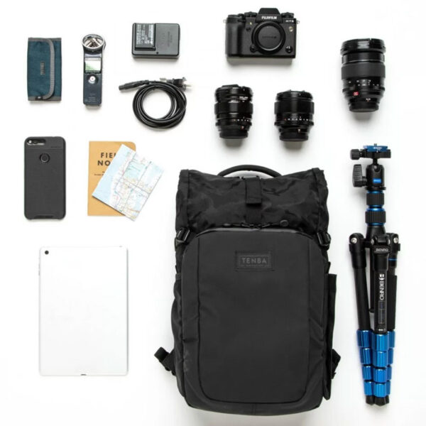 Раницата Tenba Fulton V2 10L All weather black Camo е подходяща за безогледална или DSLR камера с 2-3 обектива, плюс таблет до 9“ или таблет iPad или iPad Pro (до 28 см) . Също така пасва на DJI Mavic и други компактни дронове. Новите V2 All wheater Camo версии са по-издръжливи и устойчиви на атмосферни влияния, решени в черно с камуфлажна шарка на рол-топ джоба. Изработени от най-добрите материали отвън и отвътре, включително водоотблъскващ найлон 420D Helix™ подходящ за всякакви метеорологични условия, 600D камуфлажен найлон, YKK® Splashguard ципове и силно подсилени шевове. Обновената V2 версия на серията раници Fulton съчетава вечният винтидж стил с модерен комфорт, функционалонст и защита за камерата ви. Изработени от леки и меки материи, с дизайн вписващ се в градската среда, тези раници са удобни и притежават редица предимства, като сигурен достъп до камерата от към гърба, място за статив/монопод, отделение за таблет/лаптоп и горен рол-топ джоб, осигуряващ допълнително място за лични вещи, яке или храна.