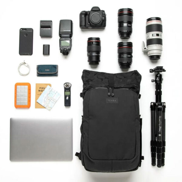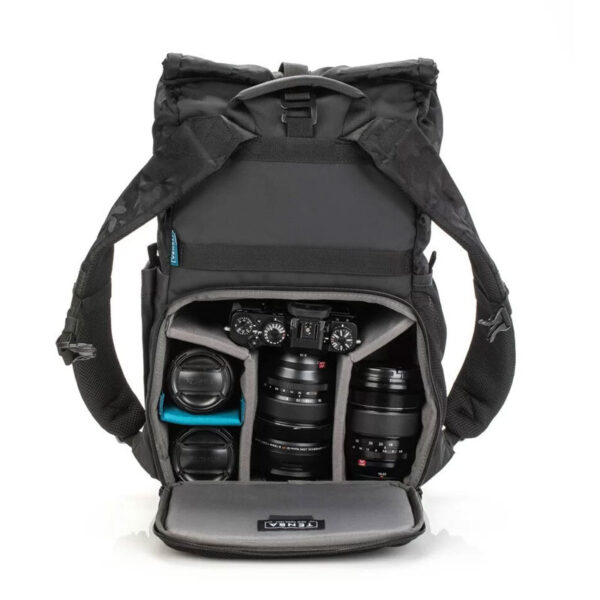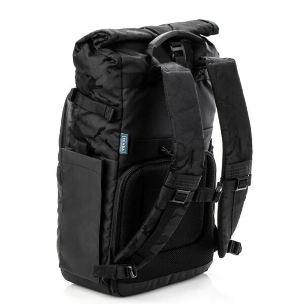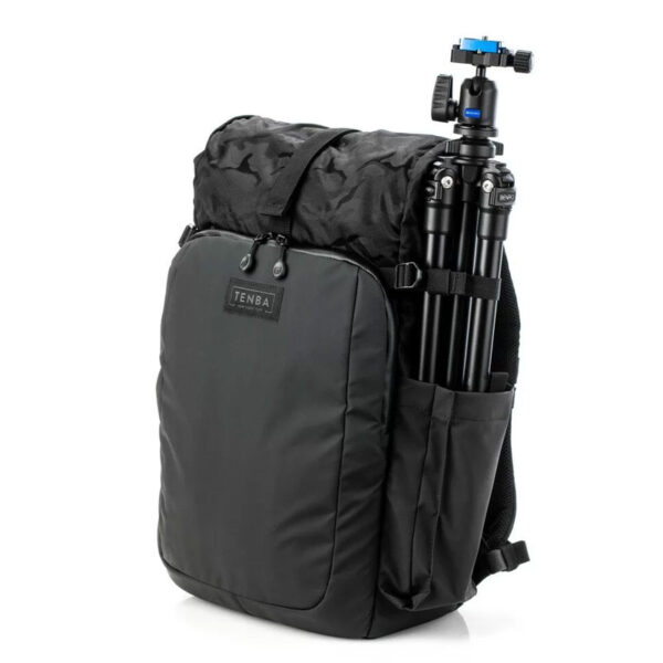 Раницата Tenba Fulton V2 16L All weather black Camo е подходяща за безогледална или DSLR камера с 4-6 обектива, плюс таблет до 16“ или таблет iPad или iPad Pro (до 40 см) . Също така пасва на DJI Mavic и други компактни дронове. Новите V2 All wheater Camo версии са по-издръжливи и устойчиви на атмосферни влияния, решени в черно с камуфлажна шарка на рол-топ джоба. Изработени от най-добрите материали отвън и отвътре, включително водоотблъскващ найлон 420D Helix™ подходящ за всякакви метеорологични условия, 600D камуфлажен найлон, YKK® Splashguard ципове и силно подсилени шевове. Обновената V2 версия на серията раници Fulton съчетава вечният винтидж стил с модерен комфорт, функционалонст и защита за камерата ви. Изработени от леки и меки материи, с дизайн вписващ се в градската среда, тези раници са удобни и притежават редица предимства, като сигурен достъп до камерата от към гърба, място за статив/монопод, отделение за таблет/лаптоп и горен рол-топ джоб, осигуряващ допълнително място за лични вещи, яке или храна.