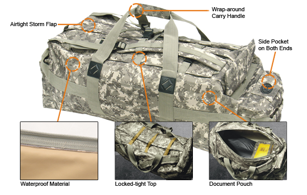 Раницата е изградена от здрави материали с вътрешната облицовка против влага и вода. Два джобове с цип в краищата, два странични джоба, вътрешния джоб за карта или документи. Проектиран да бъде използвана от военни, дори на бойното поле. Широки 2“ тежкотоварни дръжка за удобно носене и две подсилени презрамки. Усилен цип 10″ с допълнителни усилвания против дъжд и буря.