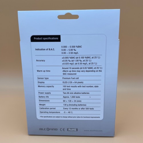 • Точност на резултата: +/- 5% при стойност 1.00 ‰ и 25℃ температура