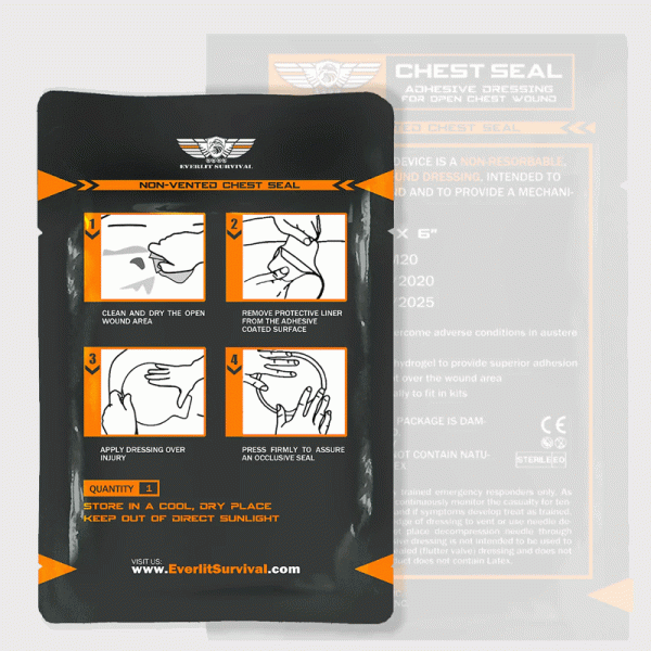 EVERLIT Emergency Non-Vented Sterile Chest Seals е създадена за запечатването на отворена гръдна рана, предотвратява белодробен колапс, причинен от влизане/излизане или множество проникващи наранявания на гръдния кош. Издръжлива със силно лепило, лесна за използване и работи при най-тежки условия, включително потни или космати жертви. За по-голямо покритие на раната и безопасност, всеки пластир за уплътняване на гръдния кош покрива ефективна кръгла област с 15.24 см в диаметър. Идеален за тактически медици, полицаи, военни, пожарникари, EMT, лов, първа помощ, ентусиасти на открито и други. EVERLIT Emergency Non-Vented Chest Seals е идеален подарък за мъже, съпруг, момче скаут и др. Малка опаковка която е удобна за съхранение, може да се побере в чанта или джоб. Издръжливата опаковка е непроницаема за вода, въздух, газове и е устойчива на пробиване и разкъсване.
