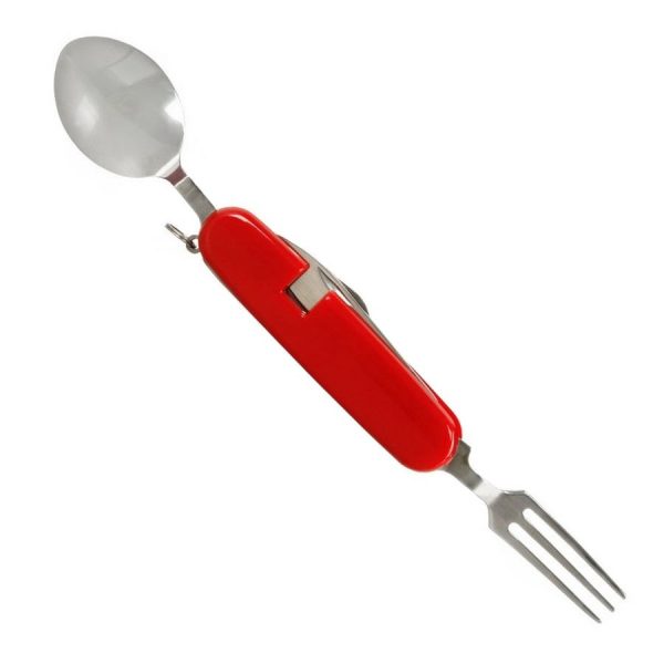 Джобно ножче с прибори за храненe e на британската компания BCB комбинира по-удобен и практичен начин комплект прибори за хранене и отварачка за консерви и бутилки. Всички компоненти са сгъваеми, като освен това, самата конструкцията може да се раздели на две отделни части. Едната половина е с нож и лъжица, докато другата е с вилица и отварачка. По този начин може да ползвате приборите по възможно най-удобният начин. След като приключите с храненето, отново може да сгънете компонентите и да прикачите двете част една за друга, напасвайки металните пластини придържащи конструкцията. В сгънато състояние ножчето е с много компактен размер – 9 х 3 см. Това, в съчетание с лекото тегло от едва 85 гр, го правят изключително подходящ прибор, като част от екипировката Ви за преходи сред природата и къмпингуване. Полимерната му дръжка е в червен цвят, което го прави лесно забележим, ако го изпуснете.