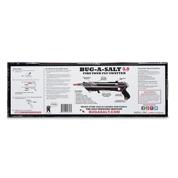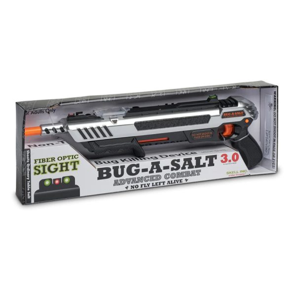 Пластмасовата пушка за мухи BUG-A-SALT 3.0 ADVANCED COMBAT FIBRE OPTIC е проектирана да стреля със сол и е готова да посрещнете сезона на буболечките, тактически подготвена с фибро оптичен мерник. Bug-a-salt не е играчка за деца, а средство за сериозно забавление на пораснали такива. Пластмасовата пушка се зарежда като помпа и изстрелва малко количество сол на разстояние 30 см-1 м и убива мухи, комари и други насекоми. Ако солта се навлажни, моля следвайте процесът по почистване: Изпразнете резервоара доколкото можете. /Напълнете резервоара с вода и оставете 15-20 минути./Изпразнете водата и направете 10 празни изстрела с дулото към земята./ Оставете 24 часа да изсъхне
