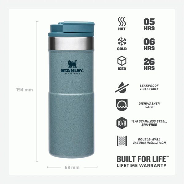 Чашата за път Stanley Classic NeverLeak Travel Mug 0.35 L е 100% устойчива на разливане благодарение на технологията NeverLeak на Stanley. Вакуумно изолираното стоманено тяло поддържа съдържанието в чашата горещо за 5 часа, студено за 6 часа и ледено студено за 26 часа. Въртящия се капак предпазва повърхност за пиене от мръсотия. Тази термо чаша е проектирана да бъде лесна за почистване, всяко част от тази пътна чаша от неръждаема стомана и може да се мие в съдомиялна машина, само на горната поставка.