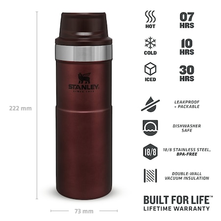 Чашата за път Stanley Trigger Action 0.47л е с дизайн който позволява използването и, за повечето видове поставки за чаши, за да е с вас, докато пътувате. Вакуумната изолация с двойна стена запазва любимата ви напитка гореща до 7 часа, студена до 10 часа и заледена до 30 часа. Тя е точният спътник за вашите градски и извънградски авантюри. Можете да изберете от широка гама цветове и размери според вкусовете си. Защита срещу протичане лесно използване с една ръка благодарение на капачката със заключващ механизъм. Капачето е с пуш бутон, който отключва приставката за пиене в горната част. Тази уникална функция прави чашата перфектна за отпиване в движение.