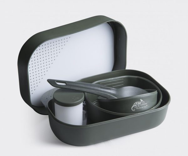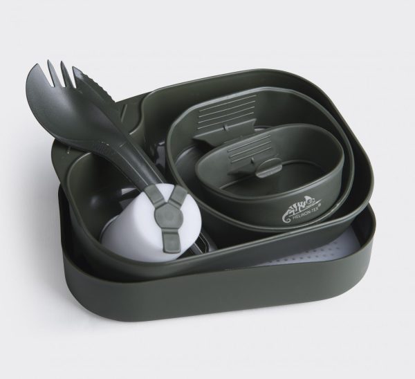 Комплектът за храна включва в себе си кутия с капак, които могат да се ползват за чинии, две сгъваеми купи, по-малки и по-голяма, съд за подправки, спорк и дъска за рязане. Произведени са в Швеция, от полипропилен свободен от BPA. Произведено от шведската компания Wildo®.