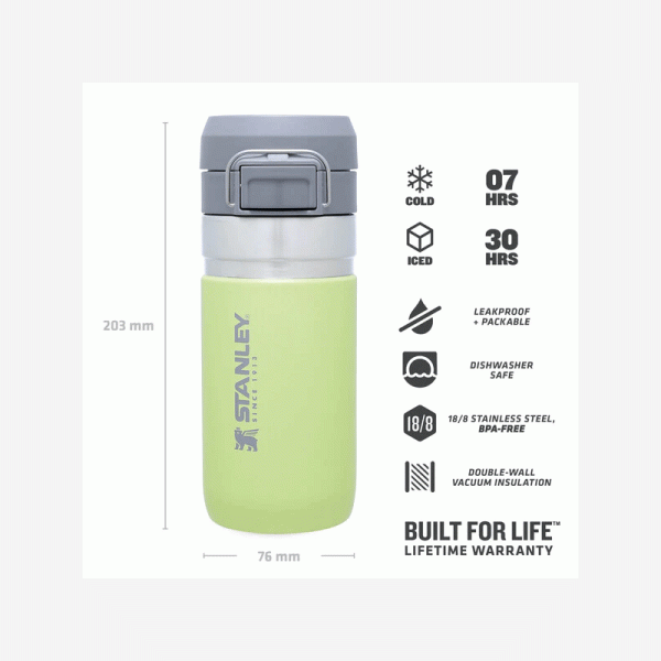 Термо бутилка за ежедневието Stanley Quick Flip Water Bottle 0.47 л е ваш постоянен спътник през деня без да се притеснявате, че ще трябва да спирате да презаредите студена напитка. Вакуумната изолация с двойна стена запазва любимата ви напитка гореща до 5 часа, студена до 7 часа и заледена до 30 часа. Quick Flip бутилката за вода с пуш бутон се събира в повечето поставки за чаши в автомобил. Тя е точният спътник за вашите градски и извънградски авантюри. Можете да изберете от широка гама цветове и размери според вкусовете си. Термо бутилката има двустепенен водонепропусклив заключващ се капак, подходящ за лесно отпиване и добавяне на лед. Може да сложите бутилката в багажа си без да се притеснявате от разливане.