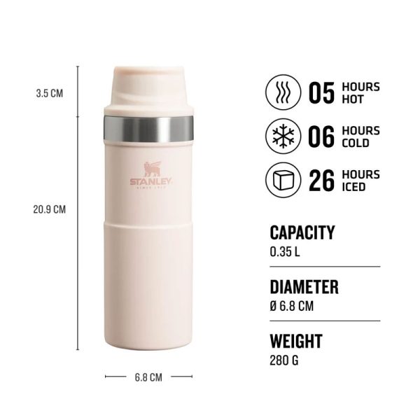 Термо чашата за път Stanley Trigger Action 0,35 л/12 унции е водонепропусклива чаша за кафе, чай и вода, без съдържание на бисфенол А (BPA). Дизайнът на чашата Stanley Trigger Action позволява да се използва с повечето видове поставки за чаши, за да е с вас, докато пътувате. Вакуумната изолация с двойна стена запазва любимата ви напитка гореща до 5 часа, студена до 6 часа и заледена до 26 часа. Тя е точният спътник за вашите градски и извънградски авантюри. Можете да изберете от широка гама цветове и размери според вкусовете си. Чашата за пътуване със защита срещу протичане е лесен за използване с една ръка благодарение на капачката със заключващ механизъм. Капачето е с пуш бутон, който отключва приставката за пиене в горната част. Тази уникална функция прави чашата перфектна за отпиване в движение.