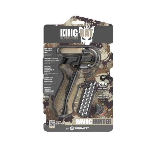 Прашката Barnett Havoc Hunter е най- модерната и прецизна, с ергономична ръкохватка и подплатена скоба за китка. Патентовани Double-X ластици, мерник с фибро оптични влакна с 3 опции за определяне на разстояние, Havoc е перфектният инструмент за ловци.