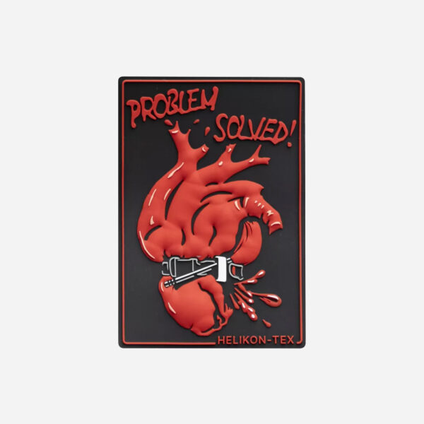 Гумен пач с надпис „Проблемът е решен!“ и рисунка на сърце с турникет, затягащ се около него, символизира спасяването на живота. Пачът може лесно да бъде прикрепен към панели с куки и примки на дрехи, раници или раници за кръста, което го прави чудесен за персонализиране.