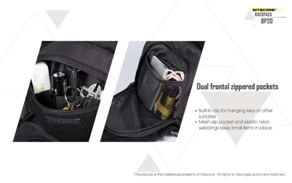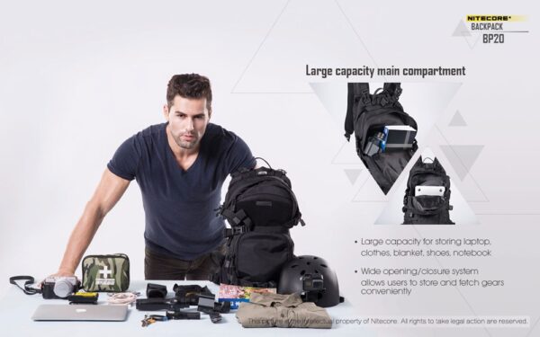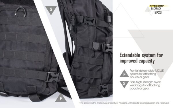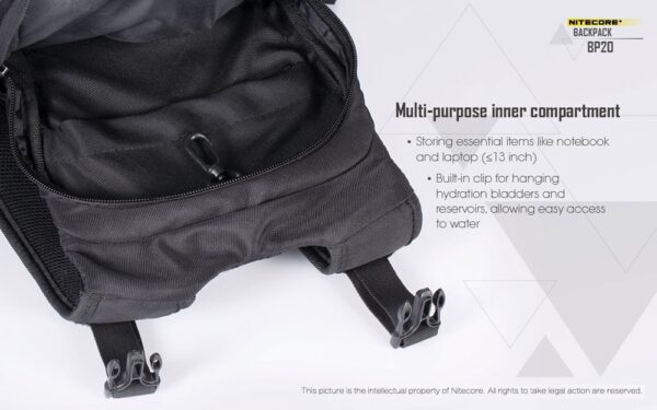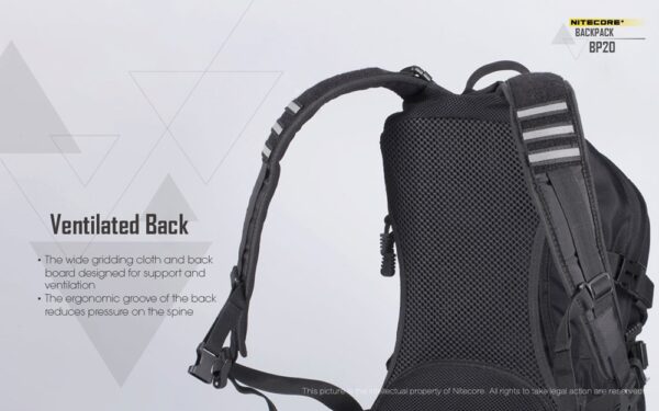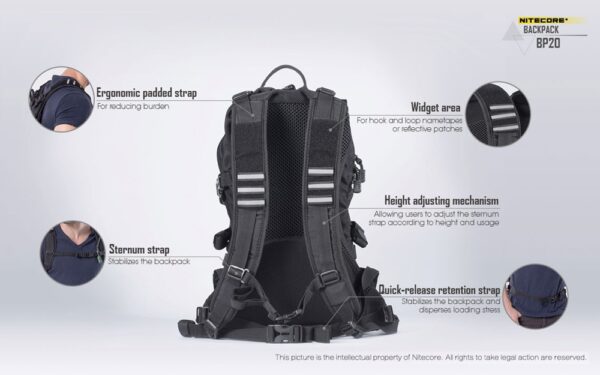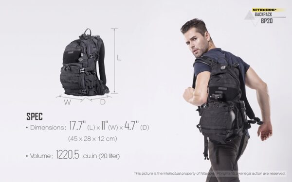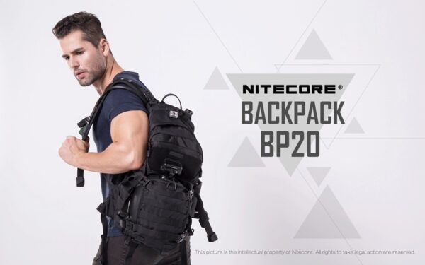 Многофункционалната раница Nitecore BP20 се предлага с вградена MOLLE система и множество отделения. Тя предлага голям капацитет от 20 литра, което я прави перфектен продукт за различни сценарии – къмпингуване на открито, преходи с раница или туризъм, кратки пътувания, градско пътуване и др. Вентилираният гръб, изработен от широка мрежеста материя и облегалка, осигурява опора и вентилация. Ергономичният жлеб, подплатените презрамки и подложката за багаж я правят прилепнала към човешкото тяло, облекчавайки натиска върху раменете и гръбначния стълб. Гръдната презрамка и бързо освобождаващият се колан стабилизират раницата и ограничават разместването на товара, когато сте в движение. Основното отделение с голям капацитет и широка система за отваряне/затваряне не само осигурява просторно пространство за съхранение на всякакви предмети, но и позволява на потребителите удобно да съхраняват и изваждат екипировка. Предните двойни джобове с цип са добри места за съхранение на малки предмети и задържането им на място. Вътрешното отделение е идеално място за съхранение на хидратационни резервоари, когато сте на открито, а също така служи и като отделение за съхранение на лаптопи, когато пътувате в града. Изработена от 1000D високоякостен найлон, тя има изключителна товароносимост, за която не е нужно да се притеснявате. Фронталната MOLLE система и страничните найлонови ленти, подходящи за окачване на допълнителни торбички, по-малки чанти или екипировка, са предназначени да увеличат приложимостта на раницата.