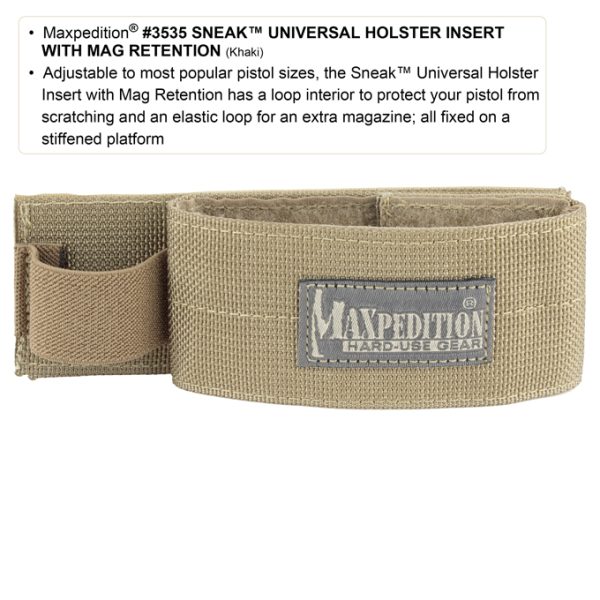 The Maxpedition SNEAK universal pistol and magazine holster fits almost all pistols and attaches, via Velcro, to Maxpedition bags, backpacks and organizers. In black colour.