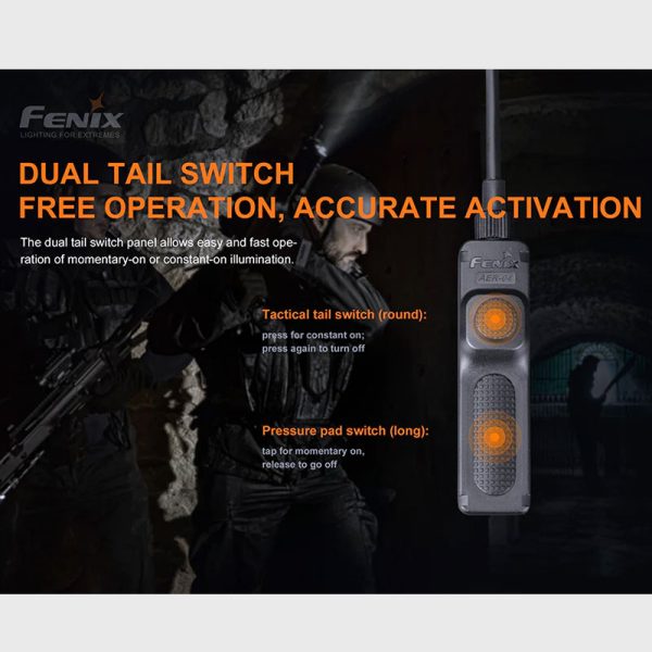 Дистанционният превключвател AER-04 има два превключващи панела, които позволяват лесно и бързо управление на моментно или постоянно включено осветление. Неговият високоеластичен PU кабел с дължина 23 см се прилага за повечето оръжейни цеви. Подходящ за тактически фенер с диаметър на опашката 1,1 инча, използващ 21700 батерии, като Fenix TK30, TK22 V2.0, TK22 UE и HT18.