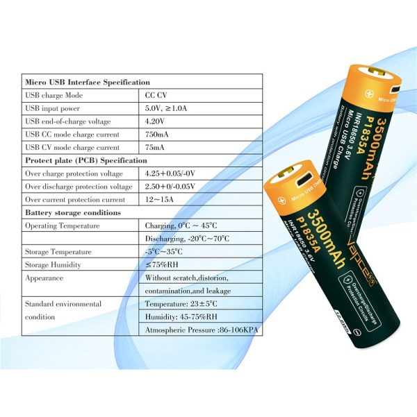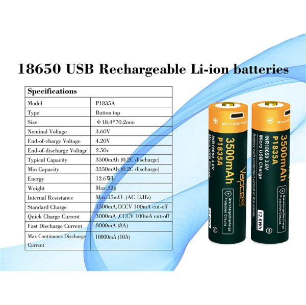 Характеристики на Зарядна батерия VAPCELL P1835A 18650 3500mAh защита и MICRO USB