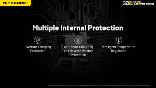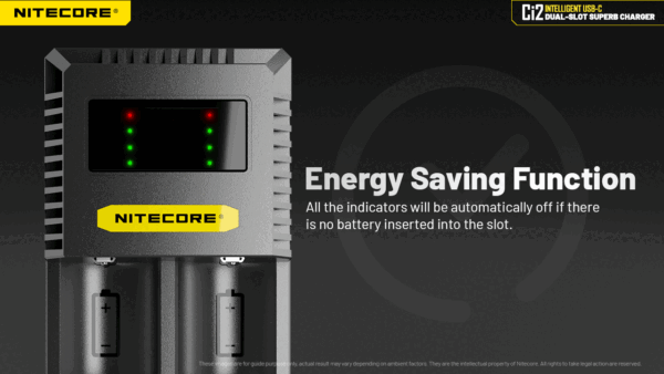 Зарядното Nitecore Ci2 за две батерии е интелигентно и лесно за употреба, благодарение на отличните си характеристики за автоматичен избор на заряден ток, автоматично разпознаване на нивото на заряд на батерията и автоматично прекратяване след завършване на зареждането. Освен това, Ci2 автоматично ще разпознае батериите с голям/малък капацитет и ще избере подходящ заряден ток по време на зареждане. Ci2 е оборудвано с двойна външна защита и множество вътрешни защити. Здравите и огнеупорни PC материали са устойчиви на сложни външни условия, а уникалните охлаждащи ребра са проектирани да осигурят изключително охлаждаща производителност за бързо разсейване на топлината, за да се избегнат евентуални опасности. Многобройните вътрешни защити могат да осигурят безопасен процес на зареждане, включително защита от презареждане, защита от късо съединение и обратна полярност, както и интелигентно регулиране на температурата. Подобно на други зарядни устройства NITECORE, Ci2 включва и оптимизирана IMR програма за зареждане на батерии, активиране на преразредена литиево-йонна батерия, интелигентен избор на режим на зареждане и функция за пестене на енергия.