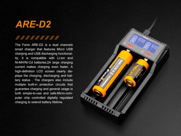 Fenix ARE-D2 е двуканално интелигентно зарядно устройство, което разполага с Micro USB зареждане и възможност за ползване като пауърбанк. Той е съвместим с Li-ion и Ni-MH / Ni-Cd батерии; 2А ток за зареждане прави зареждането още по-бързо. LCD екранът с висока разделителна способност ясно показва данни за зареждане, разреждане и състоянието на батерията. Зарядните устройства включват и множество вградени защитни вериги, които гарантират безопасността. Цифрово регулираното зареждане удължава живота на батерията.