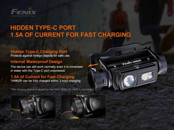 Fenix HM60R е зареден челник подходящ за всякакви цели. Три вида осветяване: на точка за далечни цели и дълги разстояния, разпръсната неутрално бяла светлина за по-добро цветопредаване и червена светлина за лагера. Включената батерия 18650 е презареждаема с USB Type-C, портът е скрит и водоустойчив. Батерията издържа до 54ч непрекъсната работа. Индикатор за новото на батерията. Голям превключвател, удобен за ръкавици, ви позволява да получите достъп до режима на осветление, от който се нуждаете. Допълнителна уникална характеристика на акумулаторния фар Fenix HM60R е неговият сензор за честота на крачка, който може да бъде предимство за тези, които биха искали да го използват за бягане. Регулируем на 180 градуса.