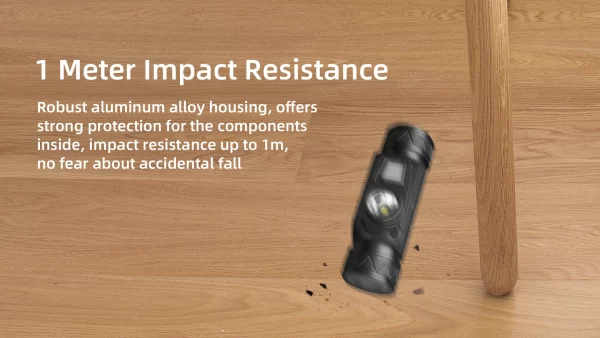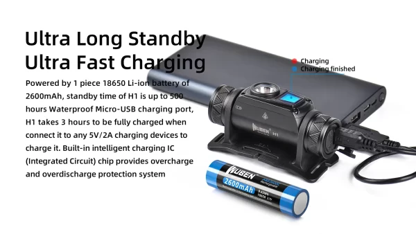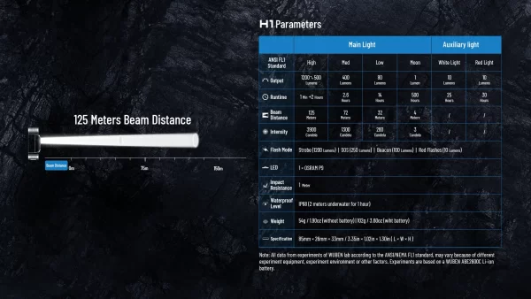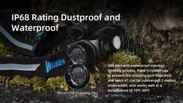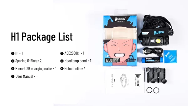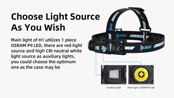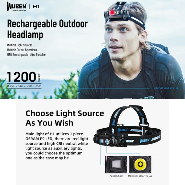 Wuben H1 1200 Лумена е най-яркият презареждаем челник с ъгъл на лъча от 100 градуса и завъртане на тялото на 180 градуса по вертикала. Оборудван със светодиод OSRAM P9 LED с висок CRI, 5 светлинни режима HIGHT, MED, LOW, MOON, SOS и червена светлина. Фенерчето е изработено от авиационна алуминиева сплав 6061, устойчива на надраскване и падане. Магнитната опашка за свободни ръце може да се прикрепи към всеки железен предмет. Захранва се от батерия 18650/2600mAh, която е в комплект.