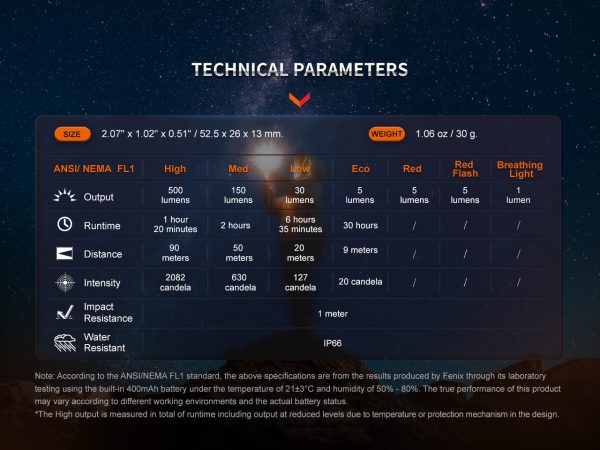 Характеристики на Фенер Fenix E03R V2.0 KEYCHAIN 500 Лумена Blue