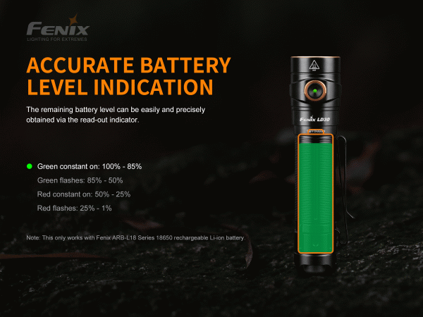 Fenix LD30 е ултра компактен фенер с тактически превключвател на опашката. Работещ с една 18650 акумулаторна литиево-йонна батерия, фенерчът излъчва пет нива на светлинен поток подходящи за различни дейности, а 2 студоустойчиви литиеви батерии CR123A могат да се използват и за спешни случаи. Допълнителните функции включват двупосочен клипс и индикатор за нивото на батерията, които са удобни при дейности на открито и рабитни задачи.