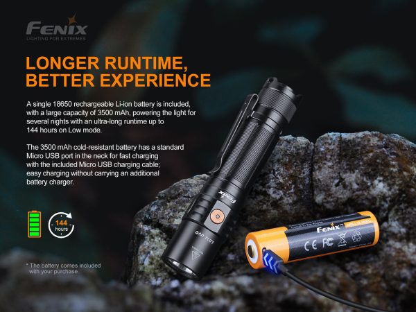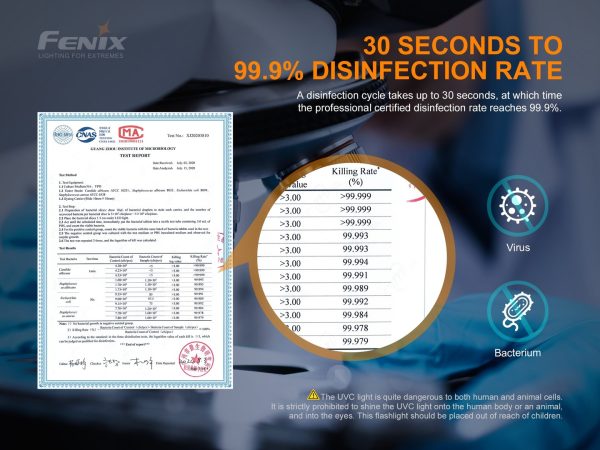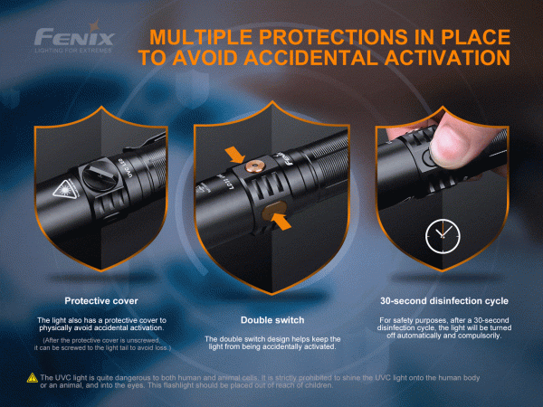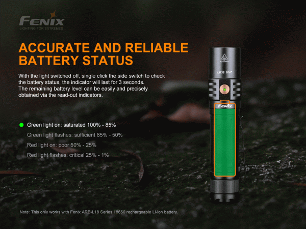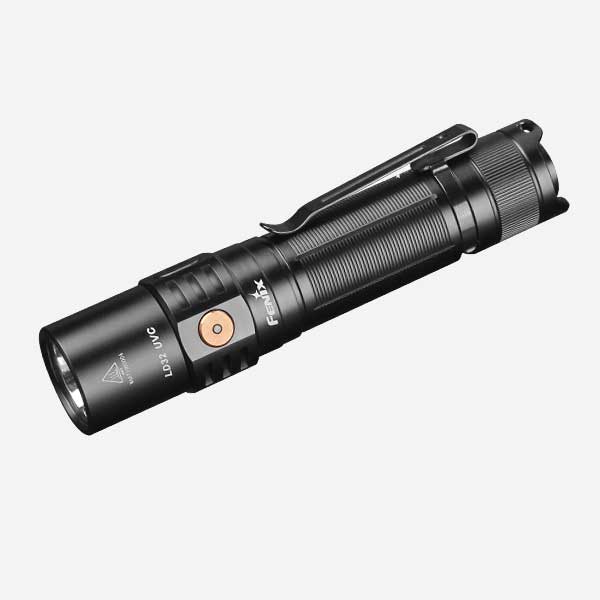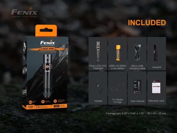 Fenix LD32 UVC е преносимо фенерче с UVC функция за дезинфекция. Захранван от една 18650 литиево-йонна батерия, мултифункционалният Fenix LD32 UVC излъчва максимална мощност от 1200 лумена и хвърля разстояние на лъча до 170 метра. Кръглият превключвател на гърлото е за незабавен избор на rрежим. Едновременно натиснете UV превключвателите от двете страни на шията, за да активирате UVC светлината, която има множество приложения, най-важното във функцията за дезинфекция. Мощната ултравиолетова UVC светлина може да дезинфекцира най-често срещаните бактерии и вируси само за десетина секунди. LD32 UVC е с малки размери, лесен за носене и подходящ за външно осветление и дезинфекция от близко разстояние.