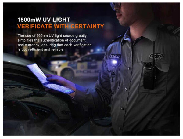 Фенерът Fenix SW05R-UV 150lm е основен инструмент за професионалисти, които се нуждаят от надеждно, преносимо UV фенерче. С три нива на яркост на бялата светлина и 1500mW UV светлина, SW05R-UV е чудесен избор за служители на правоприлагащите органи и охранителния персонал за проверка на документи за самоличност, но също така е отлично универсално фенерче с щипка. Освен това регулируемата на 200° глава означава, че можете да насочите светлината точно там, където ви е необходима. Големият клипс ви позволява да го закрепите сигурно към шапка, джоб на риза или жилетка, а магнитната опашка означава, че може да се монтира и към повечето метални повърхности. Изключително малък и захранван от вградена акумулаторна батерия с капацитет 700 mAh, този фенер е винаги готов за работа. Независимо дали сте полицай, частен охранител, работник по поддръжката или любител на джаджите, SW05R-UV е фенерчето с щипка, което е компактно, мощно и създадено, за да направи живота ви по-лесен.