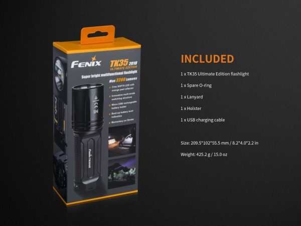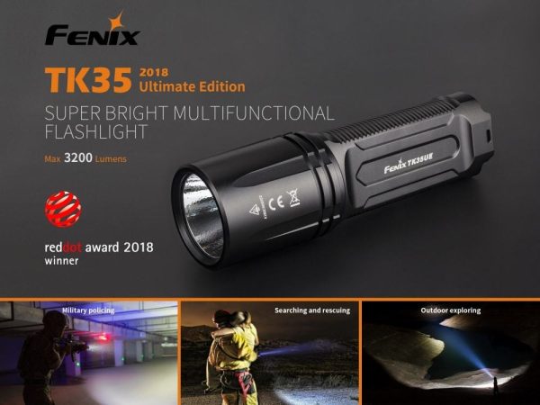 Фенерът Fenix TK35 Ultimate Edition 2018 е награден с отличието за дизайн Red Dot за 2018г. Equipped with CREE XHP70 диод, той осигурява максимална мощност от 3200 лумена и разстояние на осветеност от 300м. Иновативният превключвател превключва свободно и бързо между тактически, основни и заключващи режими. Захранва се от две 18650 батерии в захранващ блок с функция Micro USB за зареждане. Фенерът има пет изходни нива на мощност плюс режим на Строб и SOS, както и индикация за нивото на батерията. Дизайнът на плоското тяло и уникалните двойни превключватели правят Fenix TK35 Ultimate Edition изключително подходящ за военни, полиция, проучване на открити пространства, къмпинг и пещернячество.