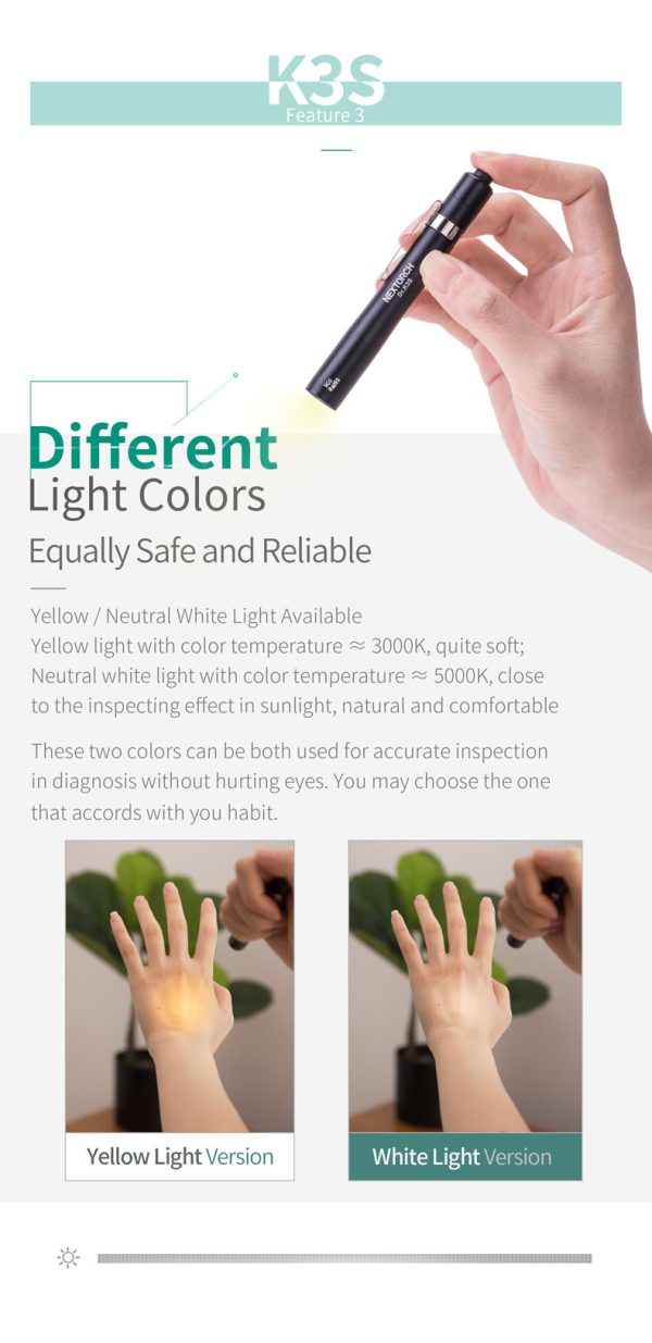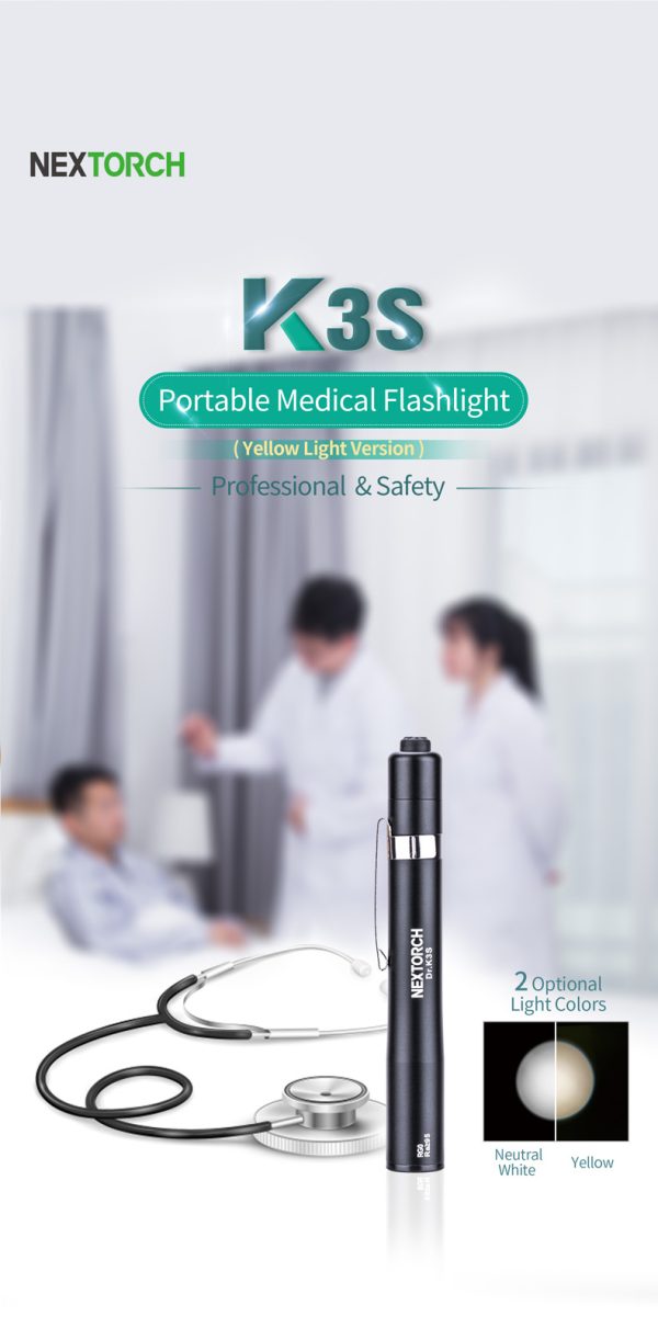 Dr.K3S пусна друга версия на медицинско фенерче с жълта светлина, с цветна температура ≈ 3000K, доста мека и с по-високо цветопредаване. Този модел може да се използват за прецизна проверка при диагностика, без да нараняват очите, изключена е опасността от синя светлина, RG0.