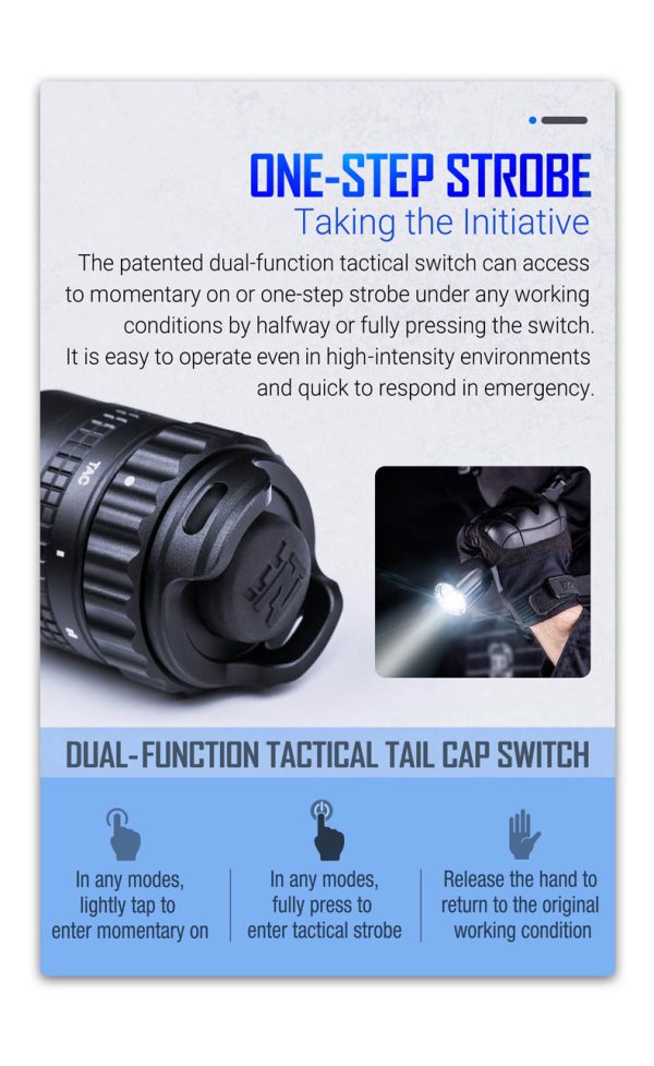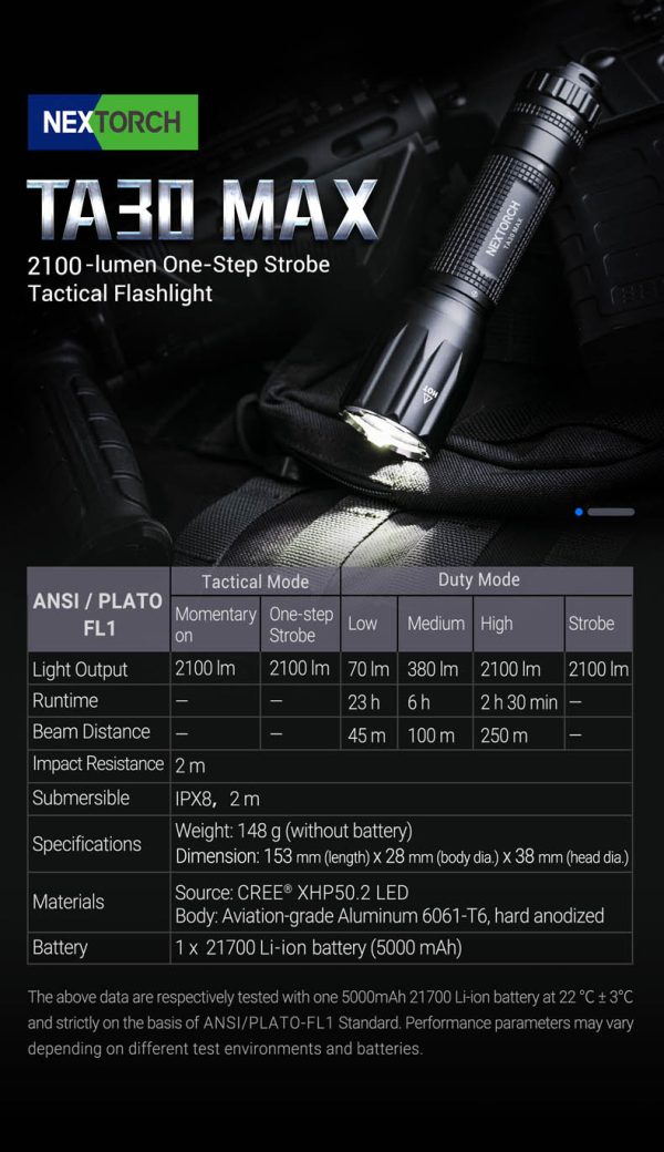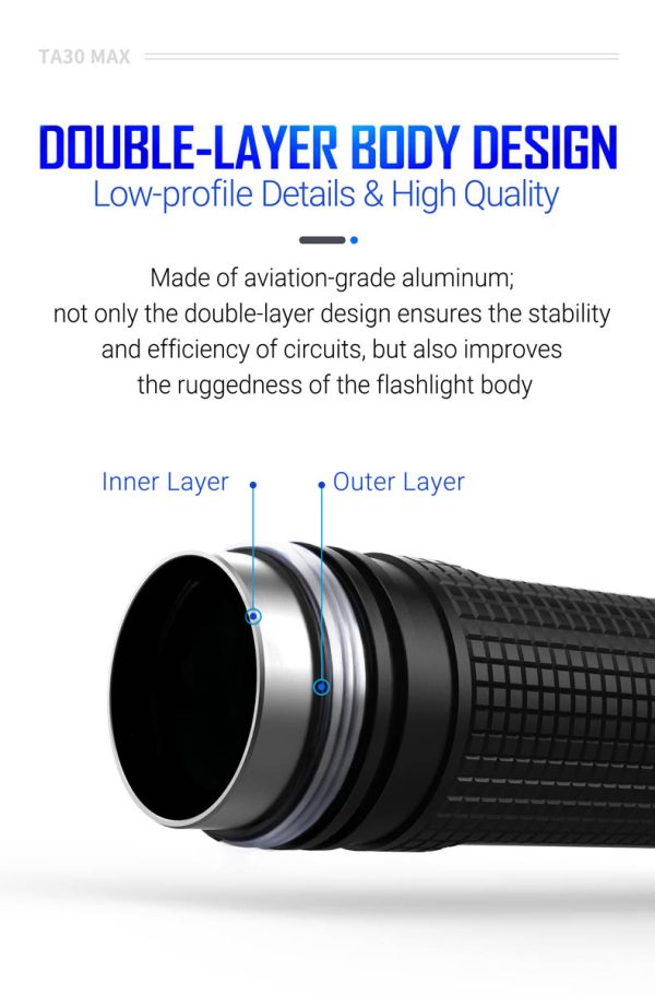 TA30 MAX е компактен и многофункционален тактически фенер с максимална мощност от 2100 лумена, предназначен за служители на правоприлагащите органи. Патентованият двуфункционален тактически превключвател (CN201621489195.1) може да има достъп до моментно светване или стробоскоп при всякакви работни условия като натиснете бутона наполовина или изцяло. Редуване режимите на светлинните нива става чрез завъртане на ротационния магнитен превключвател около задния капак, което може да стане лесно с една ръка. TA30 MAX се отличава със супер висока твърдост от нанокерамичните шипове като ефективно разбива прозорците на автомобил.