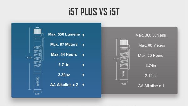 Фенерът Olight i5T Plus Pebble e със заден бутон за управление и множество опции. Отличава се с ново тяло Pebble (камъчета), уникален дизайн с отлична вентилация и здрав захват. Моделът е с цветова температура неутрално бяло (4000-5000К), NW високопроизводителен светодиод, съчетан с PMMA оптична леща, произвежда лъч от 550 лумена или 15 лумена. Мощността на батерията (2бр. алкални 1,5V AA )в сравнение с i5T е удвоена, времето на работа достига до 54 часа. Разполага и с двупосочен клипс, който може лесно да се прикрепва, към джоб или каишка на раница за използване без ръце. Мощен и с много опции, i5T Plus е страхотна EDC светлина за ежедневни задачи.