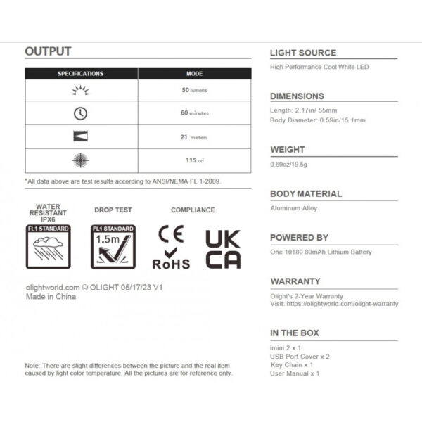 Фенерът Olight Imini2 е фенерче-ключодържател с бързо освобождаване и е по-големият брат на Olight Imini. Захранван е от 10180 80mAh литиева батерия, която се презарежда с помоща на USB. Фенерчето е с един режим с мощност от 50 лумена и CW светодиод . За да активирате светлината, просто извадете фенерчето от магнитната капачка. Магнитната основа ви позволява да го прикрепите, към железни повърхности. Бърз, супер миниатюрен и стилен, imini 2 ви осигурява удобство, когато имате нужда от светлина. В комплект с удобен ключодържател.