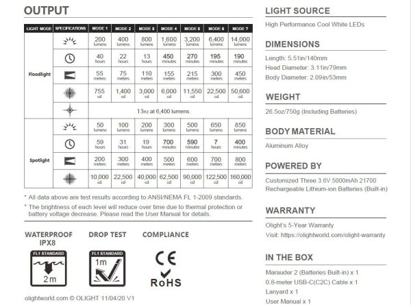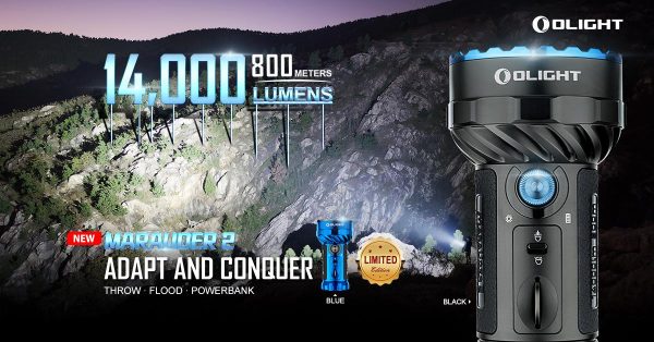 Olight Marauder II е подобрена версия на X7R Marauder. В центъра на рефлектора е добавен голям светодиод активиращ 800-метров, концентриран далекобоен лъч, както и 12 малки светодиода способни да дадат до 14 000 лумена широк лъч. Фенерът има два бутона за управление. Превключвателят в средата е за бързо превключване между концентрира, далекобоен лъч, или широк лъч. Горният въртящ се бутон е за включване, изключване на фенера, както и за плавно, интуитивно усилване на светлината. Бутонът е заобиколен от индикатори, които показват нивото на яркост, нивото на батерията и състоянието на зареждане. Фенерчето разполага с термодатчик, сензор за близост и охлаждащи ребра на рефлектора. Захранването е от вградена 54Wh акумулаторна батерия за дълго време на работа и може да служи, като захранваща банка за зареждане на други цифрови устройства. Неговият подобрен USB-C порт за зареждане позволява бързо зареждане 30W и обратно зареждане до 30W. Това позволява пълно зареждане на батерията за едва 2 ч.30 мин. Входът е влаго и прахо защитен. Могъщ като звяр и достатъчно малък, за да се побере в едната ръка, Marauder 2 е чудесна помощ за търсачи, спасители, рейнджъри, ловци и любители на открито. Корпусът е гумиран за по удобно захващане. Разполага и с възможност за прикрепяне на връзката за носене, която е в комплект. Фенерът е снабден с иновативна система за температурен контрол в реално време, която предпазва светодиодите и електрониката от прегряване. Специален сензор е вграден в предната част на рефлектора. При прекалена близост (няколко сантиметра) намалява автоматично силата на светлината до безопасни граници. Тялото е изработено от авиационен алуминий AL6061-T6 с Mil Spec тип III твърдо анодно покритие и водоустойчивост IPX8. Короната на рефлектора и бутона за включване са стоманени. Размерите на фенера са 140mm X 79 mm X 53mm и тегло 750g. В комплект: фенер Olight (с вградени батерии), зарядно устройство за 220V, USB C (C2C) кабел с дължина 80см, книжка с инструкции, връзка за носене.