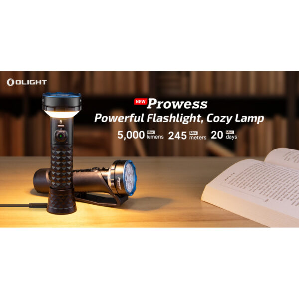 Фенерът Olight Prowess 5000lm е много мощно акумулаторно фенерче, чиято невероятна производителност, иновативни посоки на осветяване, лесен потребителски интерфейс и издръжлива конструкция, комбинирани с футуристичен, стилен външен вид, го правят напълно уникален фенер. Мощните светодиоди на лампата произвеждат максимална светлинна мощност от 5000 лумена, а широкият комбиниран светлинен лъч достига до 245 метра, разпространявайки много светлина и в близкия терен, което прави Prowess отлична светлина с общо предназначение. За разлика от традиционното фенерче, в задната част на главата има друг източник на светлина, който разпространява светлина с топъл тон назад. Тази лампа предлага максимална светлинна мощност от 800 лумена, която може да бъде безкрайно затъмнена до 2 лумена, така че може да се използва по много начини, например при туризъм, като работна светлина или светлина за четене, като светлина за настроение или като светлинен индикатор. Източникът на светлина, режимът на работа и режимът на захранване могат да се управляват с помощта на плъзгащия се превключвател и въртящия се превключвател в тялото на фенера, така че всички функции на лампата могат да се регулират лесно с една ръка по време на употреба.