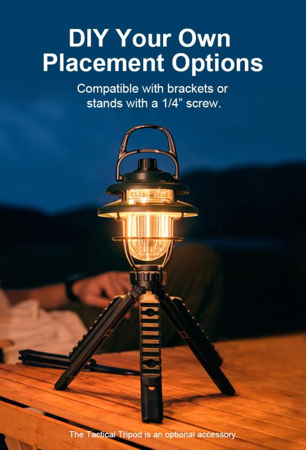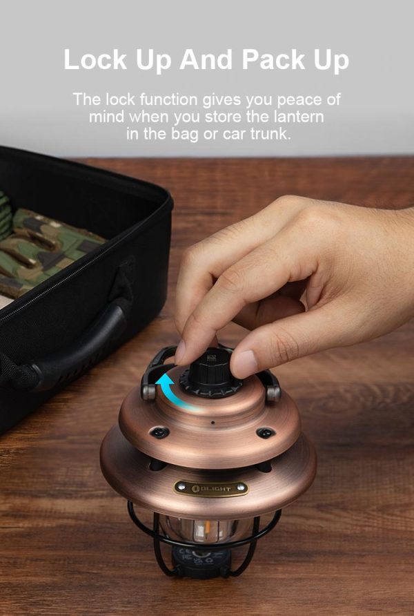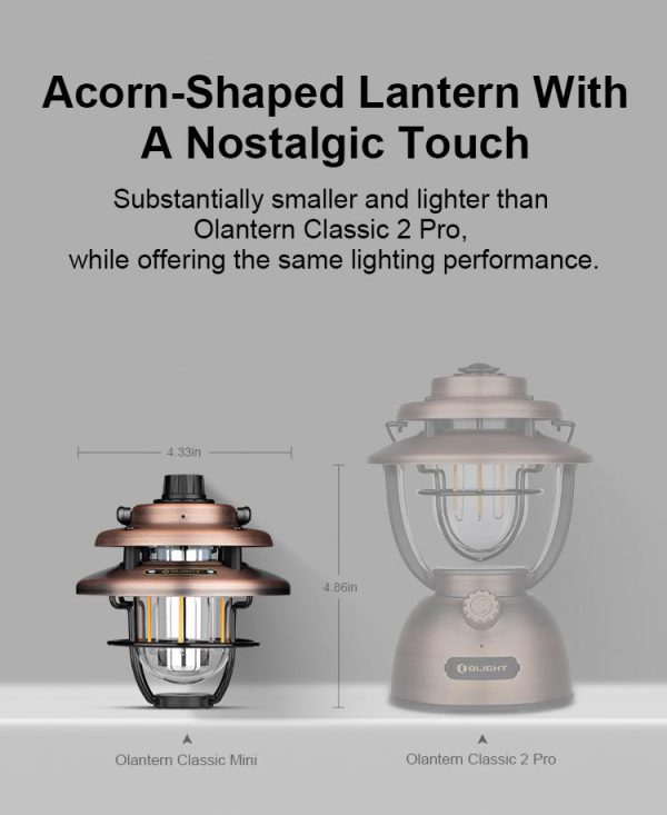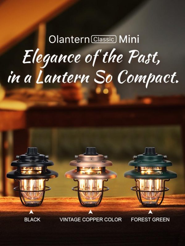 Къмпинг лампа Olight Olantern Classic Mini 300 Лумена е в ретро стил с напълно модерна технология. Въртящият се ключ осигурява безстепенно усилване на равномерно разпределена 360-градусова топла или бяла светлина от 5 до 300 лумена, отговаряща на различни изисквания за осветление, като къмпинг, декорация, използване в спални и др. Olantern Classic Mini има вградена 4500mAh 21700 батерия, която се зарежда чрез USB-C и може да се използва и като аварийна захранваща банка. Има гнездо с резба 1/4″ за монтиране на настолен статив или стойка, а дръжката има кука за закопчаване, така че можете да закачите фенера почти навсякъде.
