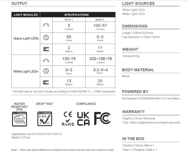 Характеристики на Къмпинг лампа Olight Olantern Classic Mini 300 Лумена