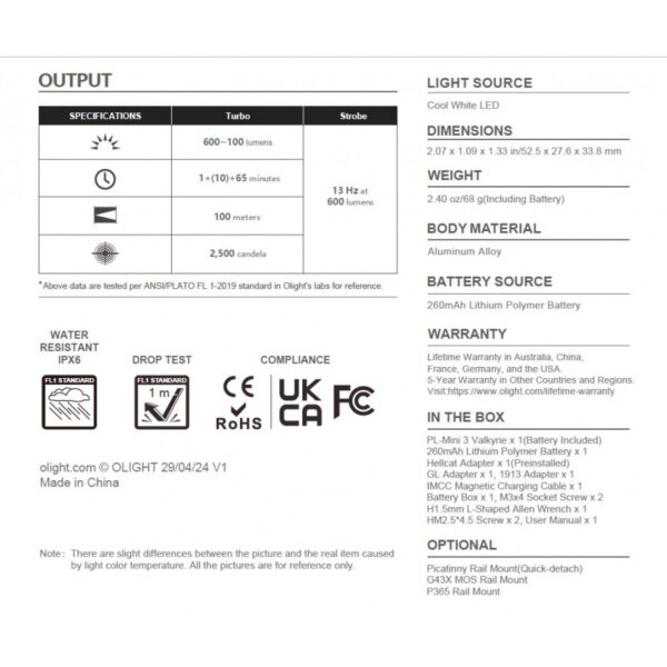 Gun flashlight Olight PL Mini 3 600lm е компактен и мощен акумулаторен фенер, предназначен както за взискателно хоби, така и за професионална употреба. Фенерът предлага максимална светлинна мощност от 600 лумена и светлинен лъч, който достига до 100 метра, ясната и ярка точка в средата предлага видимост право напред, докато дифузната светлина, разпръсната около основния лъч, помага при наблюдение на околната среда. Фенерът се доставя с адаптери за релси GL, Picatinny и Hellcat, които позволяват закрепването на светлината му към оръжието. Позицията на светлината спрямо стойката може да се променя при необходимост, което я прави гъвкав избор за различни видове оръжия. PL-Mini 3 може да се прикрепи към релсата с лесна за използване винтова приставка и се притиска върху нея директно в точката на закрепване, което гарантира добро заключване при всякакви условия.