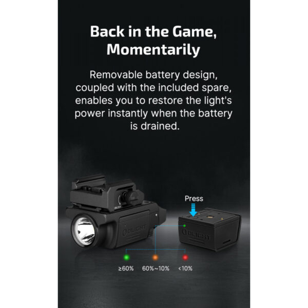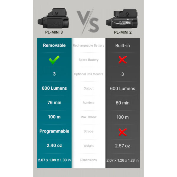Работният превключвател на PL-Mini 3 е интелигентно реализиран двоен превключвател, благодарение на който фенерът може да се използва от най-естественото за вас място. Превключвателят е поставен от двете му страни и двата превключвателя имат абсолютно еднакви функции: превключвателят може да се натиска както отзад, така и отстрани. Това дава възможност да се използва светлината поставена на различни места. Светлината може да се използва както постоянна или моментна, така и с функция Strobe. С тегло само 68 грама, PL-Mini 3 не променя много центъра на тежестта на пистолета и се вписва в кутии по-добре от много други светлини. PL-Mini 3 работи с 260 mAh li-po батерия, която може да се прикрепя и отделя от фенера, без да се налага да го сваляте от пистолета.