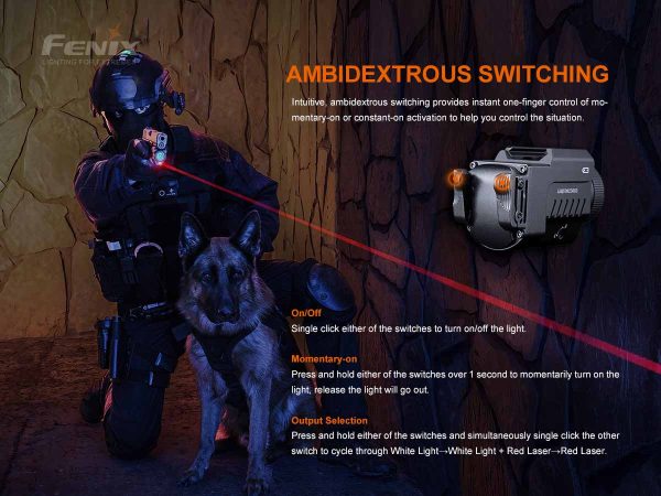 Пистолетният фенер с лазерен целеуказател Fenix GL22 Red Laser 750 Лумена е универсална тактическа светлина, която разполага с широка гама от опции. Този тактически фенер включва релсова плоча GL и 1913 за монтиране върху оръжие, оборудвано с релса. GL22 има време на работа до 17 часа с включената литиево-йонна батерия ARB-L16-700UP също така е съвместим и с батерии CR123A. Една от най-популярните характеристики на Fenix GL22 са двустранните превключватели, използвани за достъп до бялата светлина и червения лазер; функцията за моментно включване може да се използва с всеки превключвател. Използва светодиод Luminus SST20, максимална мощност от 750 лумена. GL22 е съвместим с Glock и MIL-STD-1913 Picatinny релса, включително Glock 36 със стандартна релса и Springfield XD. Тази мощна светлина е една от най-очакваните версии на Fenix и ще бъде перфектен подарък за всеки любител на стрелбата.