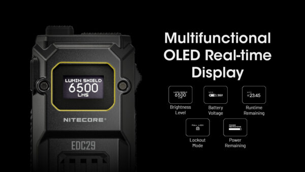 Фенерът Nitecore EDC29 е ултратънък, високопроизводителен фенер, предназначен за ежедневно носене и тактически приложения. Създаден да бъде най-мощният ултратънък тактически фенер до момента, той се гордее с впечатляващите 6500 лумена яркост и разстояние на лъча от 400 метра, всичко това събрано в елегантен дизайн, който приляга удобно в ръката ви. С тънък дизайн и мощната производителност на серията TM (Tiny Monster), EDC29 предефинира какво може да постигне един компактен фенер. Изграден с двойна LED система (2 x UHi 20 MAX светодиода) с 18 ядра, той осигурява несравнима яркост и изключителни възможности за дълъг обхват в ултратънък дизайн, превъзхождайки по-обемните фенерчета със среден размер и задавайки нов стандарт по отношение на производителността. Интегрираната технология за управление на светлината осигурява интуитивно потребителско изживяване. С три гъвкави режима – LUMIN SHIELD™, Second-Gen STROBE READY™ и 400-Meter Tactical Search Mode – потребителите могат бързо да се адаптират към различни сценарии. LUMIN SHIELD™ създава светлина от 6500 лумена за незабавна защита в широка зона, която ви предпазва от заплахи и осветява околността, без да причинява отблясъци. Режимът STROBE предлага произволно променящи се честоти между 16 Hz и 20 Hz и причинява по-силни замаяни ефекти поради неадаптивността на невъоръженото око. В тактически режим SEARCH, двете основни LED ядра могат да се активират самостоятелно, за да генерират зашеметяващ лъч от 3000 лумена и 40 230 cd, съперничейки си с тактическите компактни фенерчета по отношение на обхвата. С двойни двустепенни тактически задни превключватели, EDC29 предлага прецизен контрол върху включване, изключване и регулиране на нивото на яркост с половин или пълно натискане. Персонализируемият тактически бутон позволява на потребителите да приспособят функциите си към своите нужди – наполовина натискане за ТЪРСЕНЕ и пълно натискане за LUMIN SHIELD™ или STROBE – което позволява бърза реакция в критични ситуации. Популярната функция Rapid Lock™ осигурява бързо и лесно заключване; просто плъзгане ви позволява да заключите напълно, наполовина заключите или отключите фенерчето за незабавна реакция, особено в критични ситуации. EDC29 се отличава със здрав корпус с композитен, противоплъзгащ дизайн. Частите на тялото от неръждаема стомана отпред и отзад са безпроблемно интегрирани с рамка от въглеродни влакна, създавайки уникална текстура, подобна на броня, която осигурява сигурен и удобен захват – независимо дали го използвате с голи ръце или с ръкавици. Целият монтаж е подсилен от четири комплекта свързващи болтове, осигуряващи издръжлива и здрава конструкция. Въпреки здравата си конструкция, EDC29 е лек, само 160 грама (5,64 унции), без да се жертва здравината. Той е способен да издържи на силен натиск, усукване и огъване. Захранван от вградена литиево-йонна батерия с капацитет 2500 mAh, EDC29 постига до 61 часа работа. Това е 47% увеличение на капацитета в сравнение с предишния EDC27 UHi, намалявайки нуждата от чести презареждания. OLED дисплей предоставя информация в реално време за нивото на яркост, напрежението на батерията, оставащия заряд и други. Освен това фенерчето включва два режима на заключване, функция за предварително зададено ниво и функция за защита на сензора. То е водоустойчиво съгласно стандартите IP54 и може да издържи на падания от височина 1 метър, което гарантира надеждн