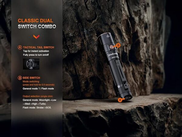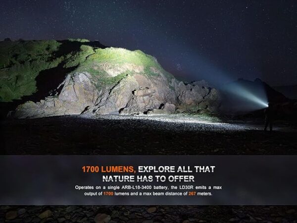 Зарядният фенер Fenix LD30R LED е за всекидневно употреба с максимална мощност от 1700 лумена. Активирайте го с тактическия превключвател на опашката и преминете през седем режима на осветление със страничния превключвател. Презареждането през USB Type-C с индикатор за нивото на батерията ви помага да поддържате фенера зареден и в готовност. Освен това двупозиционната му щипка за колан го прави още по-удобен за носене. С издръжлива водоустойчивост и прахоустойчивост със степен на защита IP68 ще разполагате с фенер, който няма да ви подведе.